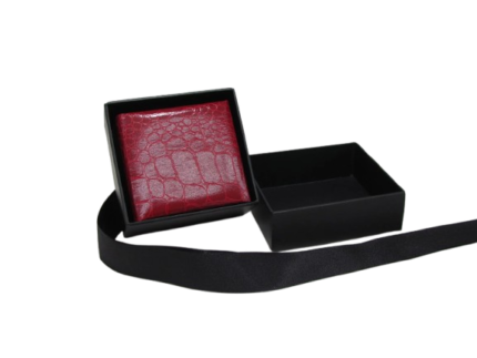 Estojo com revestimento externo em papel Pellaq e interno em suede com caixa externa preta e fita.