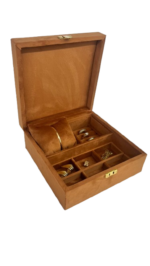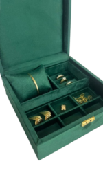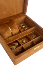 Dividido 8 espaços, 6 quadriculados, espaço para anéis e uma almofada para relógio/bracelete.